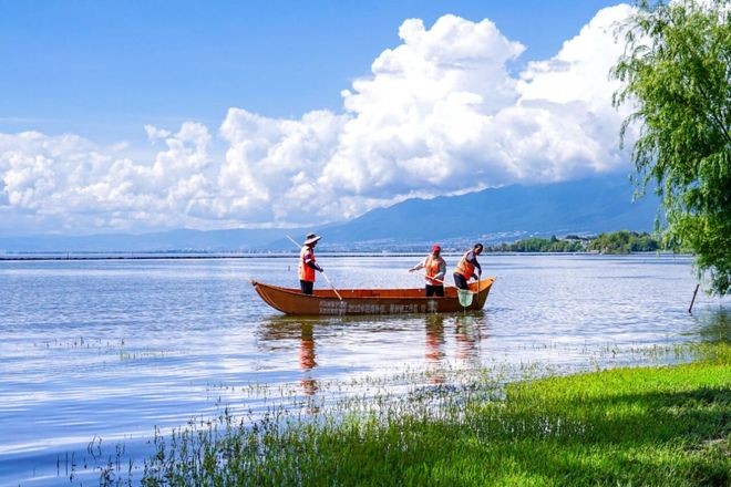 早上七點(diǎn),晨光剛灑在洱海上,嚴(yán)炳其就和同事劃著船,開始打撈死亡水草。今年,是他堅(jiān)守洱海保護(hù)一線的第十年。
