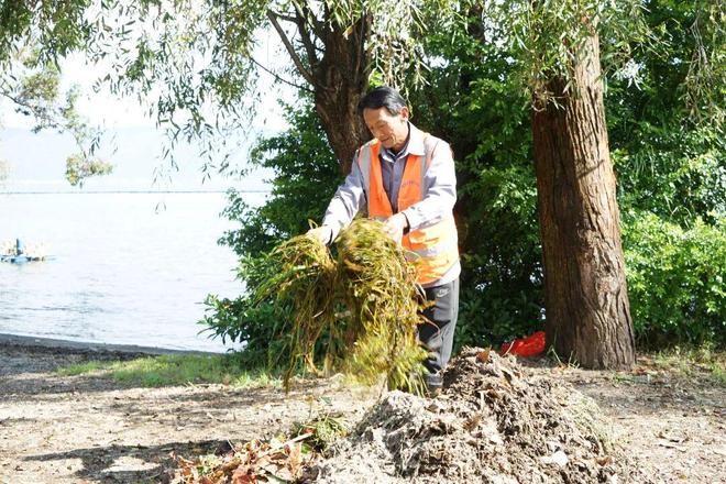 后來(lái),他又先后擔(dān)任庫(kù)塘管理員、灘地管理員,負(fù)責(zé)打撈洱海的死水草和藍(lán)藻?!耙郧懊刻煲獡苾汕Ф嘟锢退浪?,全靠人背肩挑,最遠(yuǎn)要走兩公里才能運(yùn)到公路上?!边@樣一干就是十年。