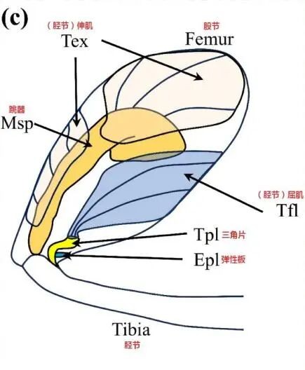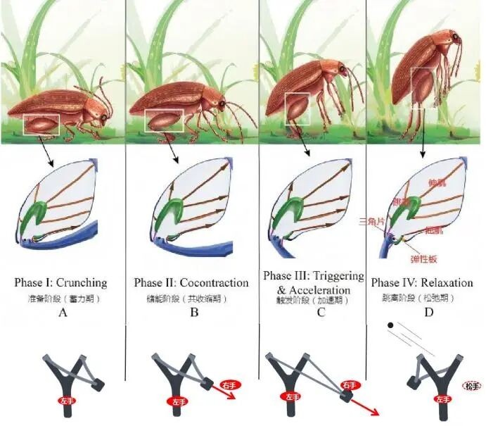 跳器、三角片、彈性板,以及后足股節(jié)的外殼、伸肌和屈肌、跳甲的整個(gè)身體共同組成了彈弓六件套。