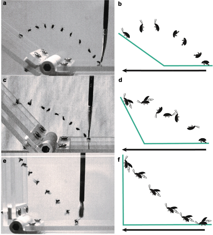 通過高速攝像機(jī),研究者發(fā)現(xiàn)跳甲能在空中通過開合翅膀、調(diào)整身體姿態(tài),實(shí)現(xiàn)多軸旋轉(zhuǎn)(俯仰、翻滾),從而精準(zhǔn)著陸于不同角度的表面,甚至能在翅膀閉合時(shí)僅憑身體調(diào)整成功著陸。