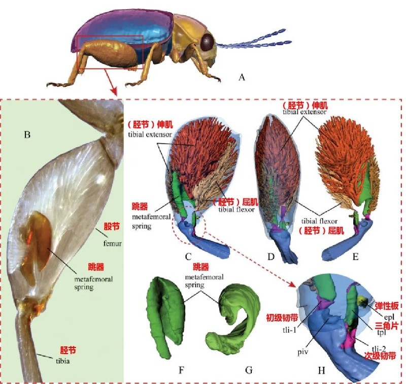 A.跳甲外形三維模型(側(cè)視圖),顯示出膨大的后足股節(jié)。B.暗場(chǎng)顯微鏡下跳甲(Trachytetra obscura)的后足結(jié)構(gòu)。C–H.基于顯微CT掃描的黃櫨脛跳甲(Asiophrida xanthospilota)后足三維重建圖像:C 側(cè)視圖;D 背視圖;E 側(cè)視圖(與圖C相反視角);F 跳器的側(cè)視圖;G 跳器的腹視圖;H 股脛關(guān)節(jié)(圖片修改自論文DOI: 10.3897/zookeys.915.38348)