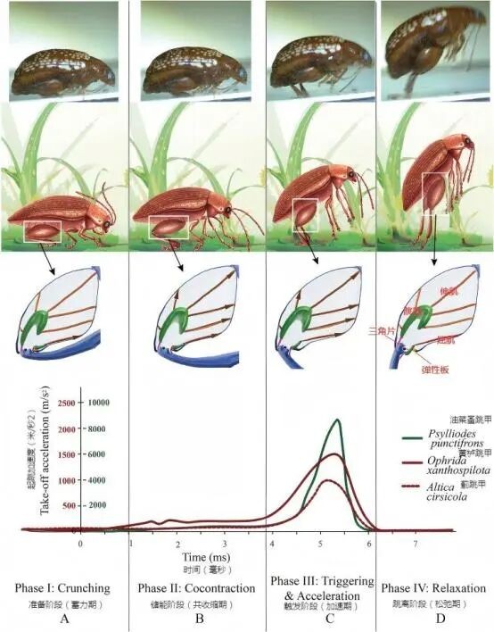研究發(fā)現(xiàn),跳甲的跳躍過程可分為四個(gè)階段: