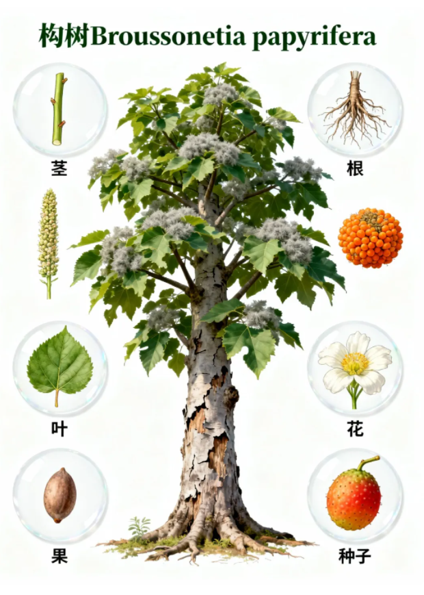 "構(gòu)樹不僅在中國造紙史上占有重要地位,在民間也有許多用途。構(gòu)樹的嫩葉可作蔬菜食用,種子可榨油,樹皮纖維還可制作繩索和漁網(wǎng)。在中醫(yī)典籍中,構(gòu)樹的果實(shí)(楮實(shí)子)、根皮、樹葉都有藥用價(jià)值,體現(xiàn)了古人對這種普通植物的深刻認(rèn)識。構(gòu)樹雖然平凡,卻在人類文明發(fā)展中默默貢獻(xiàn)著自己的力量。