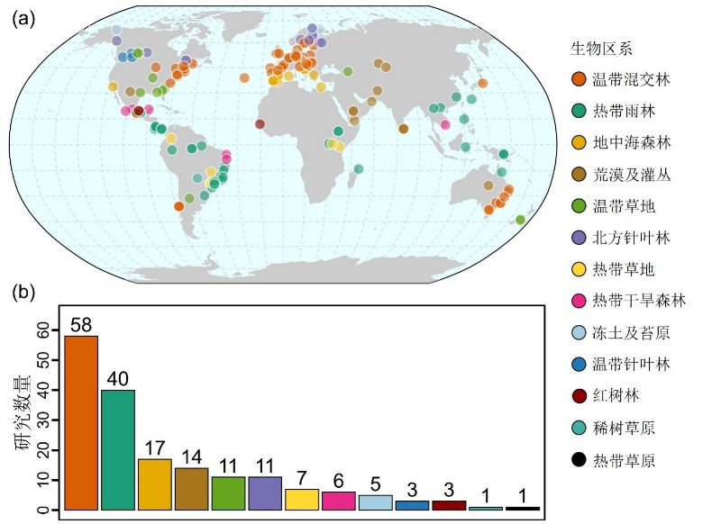 a.以往研究的地理分布及對(duì)應(yīng)生物區(qū)系;b.不同生物區(qū)系的研究數(shù)量。