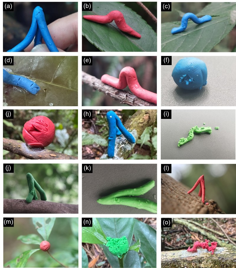動(dòng)物的感官系統(tǒng)與人類可能存在差異。在捕食過程中,許多動(dòng)物不僅依賴視覺信息,還會(huì)綜合利用氣味、運(yùn)動(dòng)等多種感官線索進(jìn)行獵物識(shí)別。然而,橡皮泥模型通常僅具備靜態(tài)的視覺特征,缺乏其他重要的感官信息。動(dòng)物真的能像人類一樣分辨各種模型嗎?它們?cè)谀P蜕狭粝碌暮圹E,真的能準(zhǔn)確反映生物互作關(guān)系嗎?為驗(yàn)證橡皮泥模型法在量化生物互作中的可靠性,我們?cè)O(shè)計(jì)并實(shí)施了大規(guī)模野外實(shí)驗(yàn)。