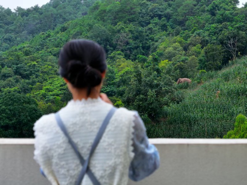 游客在大象咖啡莊園與野生亞洲象“同框”。