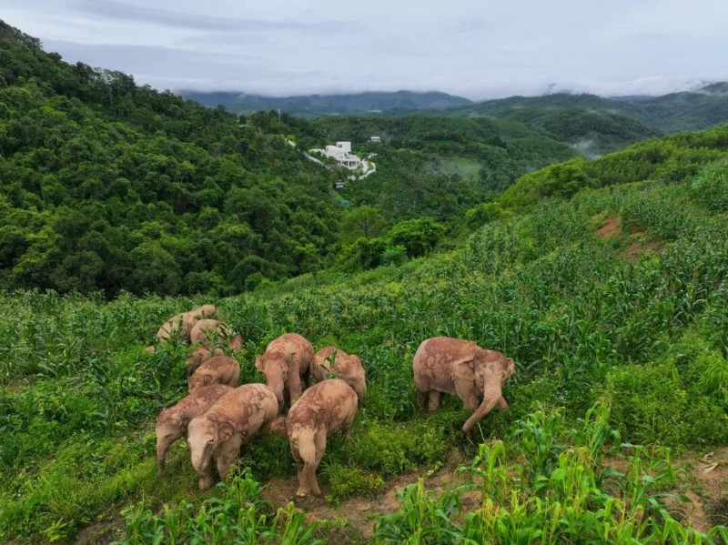 野生亞洲象在大象咖啡莊園旁的“大象食堂”覓食。