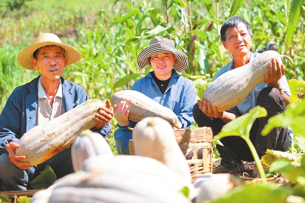 在海拔約1500米的何元鄉(xiāng)組軍門村,“玉米 南瓜 青豌豆”成了村民增收的“金鑰匙”。村民羅玉菊今年在30多畝玉米間種了蜜本南瓜?!懊郾灸瞎夏苜u12萬元左右,玉米能賣3萬元,等南瓜摘完以后就種青豌豆?!绷_玉菊滿臉喜悅地規(guī)劃著下一步的種植打算。