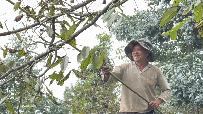走進(jìn)中心鎮(zhèn)左岔村2組,村民張祖美家的核桃林里一派忙碌景象。年近50的張祖美動(dòng)作麻利,順著粗壯的樹(shù)干熟練攀爬,穩(wěn)穩(wěn)站在核桃樹(shù)枝丫間。他手持長(zhǎng)竹竿,對(duì)準(zhǔn)掛滿(mǎn)青果的枝條輕輕敲打,“啪嗒、啪嗒”的聲響此起彼伏,一個(gè)個(gè)裹著青皮的核桃應(yīng)聲落下。