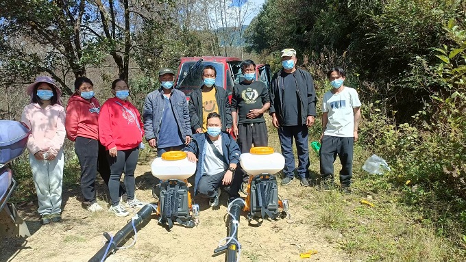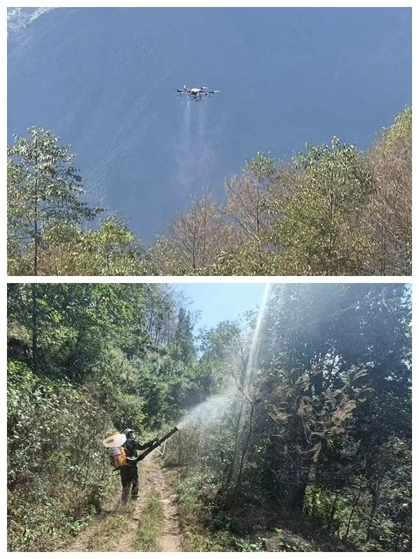 本次榿木食葉害蟲發(fā)生區(qū)域處于匹河怒族鄉(xiāng)果科村臘戶都小組周邊,危害面積達227.5畝,人工防治難度較高。針對這一情況,工作人員采取“無人機 人工”的無人機綜合防治模式,對受蟲害影響的榿木林地精準施藥。所用藥劑均為高效低毒殺蟲劑,嚴格按照規(guī)定劑量配比后進行噴灑。