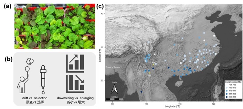 圖1 (a)蔊菜實(shí)驗(yàn)照片;(b)基因組大小變異假說;(c)蔊菜基因組大小分布格局