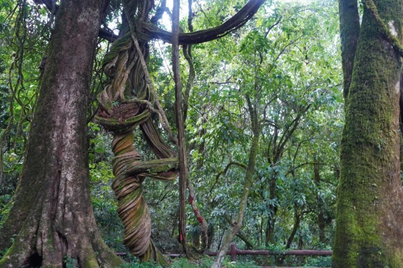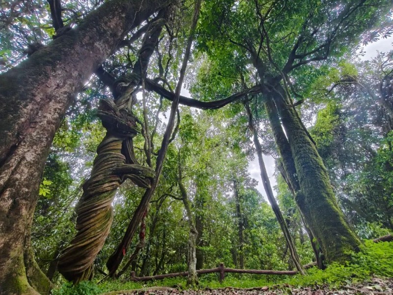 路是愈走愈幽深的,兩旁的原始叢林密不透風(fēng),蕨類的嫩碧與巨木的蒼綠交織纏繞,暈出一片幾乎要滴出水的濃翠,空氣里滿是植物蒸騰出的、帶著甜味的濕潤。塵世的喧囂早被這層疊綠意濾成了虛無,只余下一種龐大無邊的靜——腐葉在腳下輕響,溪聲從蕨叢后漫來,飛鳥振翅的脆鳴,被這靜謐托著,格外清亮。此行,只為赴一場與昔馬鎮(zhèn)那株“千年血藤王”的時(shí)光約會(huì)。