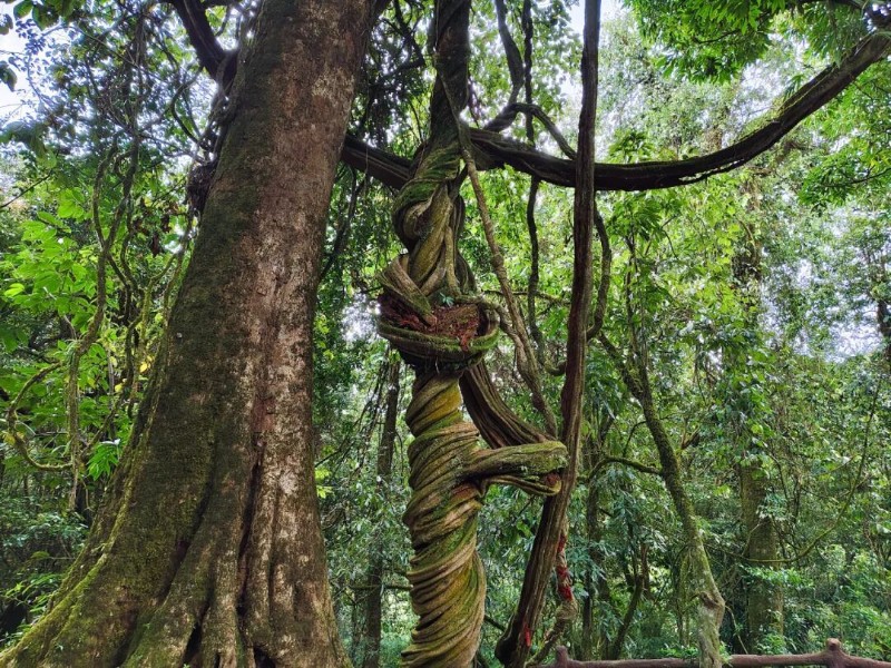那一刻,言語蒼白。它并非驟然出現(xiàn),而是從一片混沌的綠意中,逐漸剝離出形態(tài)。起初只當(dāng)是幾棵古樹盤根錯(cuò)節(jié)地共生,待眼睛適應(yīng)了林間幽微的光線,才駭然發(fā)覺,那竟是一體。它以一種近乎蠻橫的力量感,虬曲、盤繞、絞結(jié)著向上生長,像一條從地心蘇醒的蒼龍:有的枝干昂首欲向云端,仿佛下一秒就要騰空;有的卻又戀戀不舍地垂落,將龐大的身軀死死錨固在這片土地上。褐色的藤身早已長成合抱之木,樹皮皸裂成深邃的紋路,像老人手背上暴起的筋絡(luò),更像是刻寫在大地上的、千年歲月的編年史。
