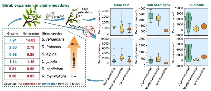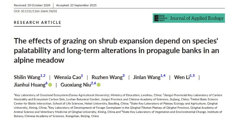 相關(guān)研究結(jié)果以“The effects of grazing on shrub expansion depend on species palatability and long-term alterations in propagule banks in an alpine meadow”為題發(fā)表于生態(tài)學(xué)領(lǐng)域經(jīng)典期刊《Journal of Applied Ecology》。我園恢復(fù)生態(tài)學(xué)研究組王世林博士為論文第一作者,甘肅農(nóng)業(yè)大學(xué)曹文俠教授和我園恢復(fù)生態(tài)學(xué)研究組組長(zhǎng)牛國(guó)祥副研究員為論文通訊作者,河北大學(xué)王汝振教授、青海大學(xué)王金蘭和李文副教授、中國(guó)科學(xué)院植物研究所黃建輝研究員共同參與了本研究。研究得到甘肅農(nóng)業(yè)大學(xué)草學(xué)一流學(xué)科突破工程暨草業(yè)生態(tài)系統(tǒng)教育部重點(diǎn)實(shí)驗(yàn)室“揭榜掛帥”項(xiàng)目(KLGE-2024-07)、廬山植物園植物專(zhuān)項(xiàng)(2024ZWZX03, 2024ZWZX02, 2024ZWZX01)和國(guó)家自然科學(xué)基金項(xiàng)目(31360569, 32060269)等資助。