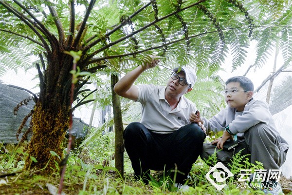 “這是與恐龍同處一個(gè)時(shí)代現(xiàn)存的唯一木本蕨類(lèi)植物,被科學(xué)界稱(chēng)為研究古生物和地球演變的‘活化石’,堪稱(chēng)植物界的‘國(guó)寶’,屬?lài)?guó)家二級(jí)重點(diǎn)保護(hù)野生植物?!痹诖罄戆鬃遄灾沃菽蠞疽妥遄灾慰h的無(wú)量山國(guó)家級(jí)自然保護(hù)區(qū)森林秘境中,護(hù)林員正在給一位小朋友講解桫欏的科普知識(shí)。