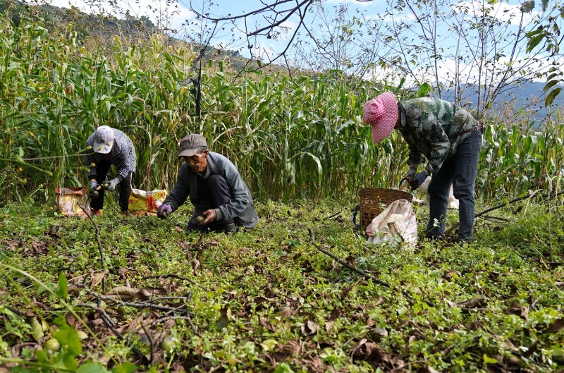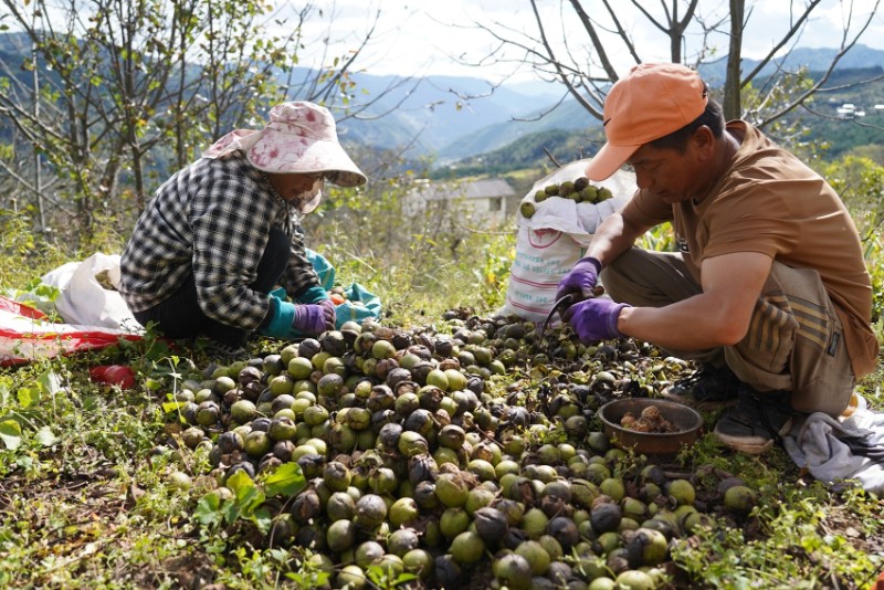 近日,云南省大理白族自治州劍川縣象圖鄉(xiāng)的2.87萬(wàn)畝核桃園進(jìn)入豐收季。漫山遍野的核桃樹(shù)上,飽滿的果實(shí)壓彎枝頭,村民們?cè)诹珠g穿梭來(lái)回,有條不紊地采收、脫殼、晾曬,山間地頭一派忙碌的景象。