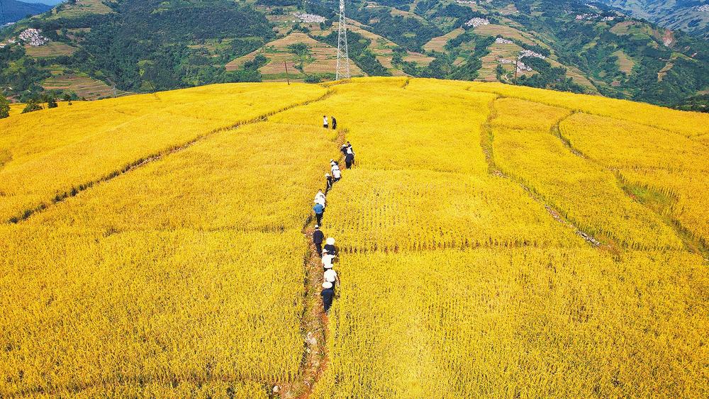 金秋時(shí)節(jié),綠春縣的層層山巒間稻浪翻金、清香四溢,曾經(jīng)干旱貧瘠的荒坡地上,如今已是穗浪連綿、機(jī)聲隆隆。聯(lián)合收割機(jī)穿梭行進(jìn),農(nóng)戶(hù)笑容洋溢,一粒粒飽滿(mǎn)的稻谷盡數(shù)歸倉(cāng)。這片高山旱地,真正變成了豐收的糧倉(cāng)、希望的田野。