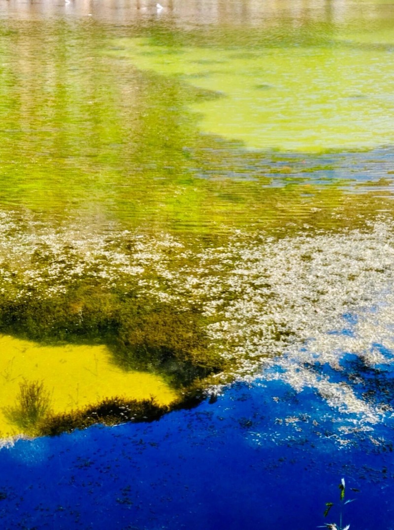 黑龍?zhí)杜?,一樹秋黃倒映水中,水草也被浸染成了鵝黃,水底透出的黃、綠、藍(lán)色調(diào)混合在一起,像一幅油畫嵌在湖心。水面與岸邊的色彩虛實(shí)相映,分不清究竟是樹葉染黃了水,還是秋水浸潤(rùn)了樹。