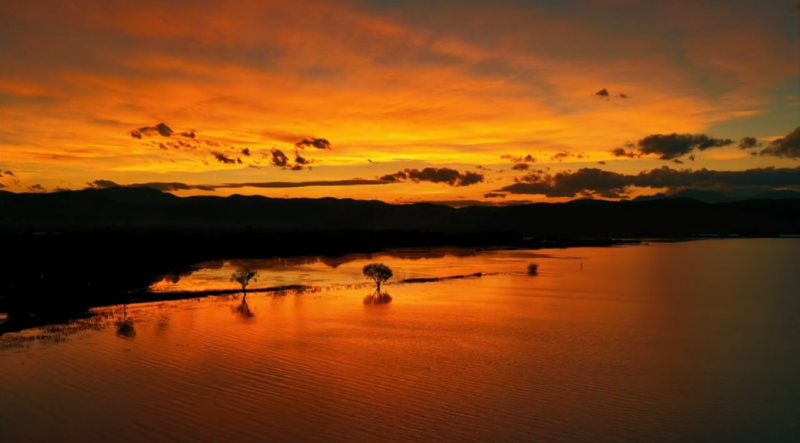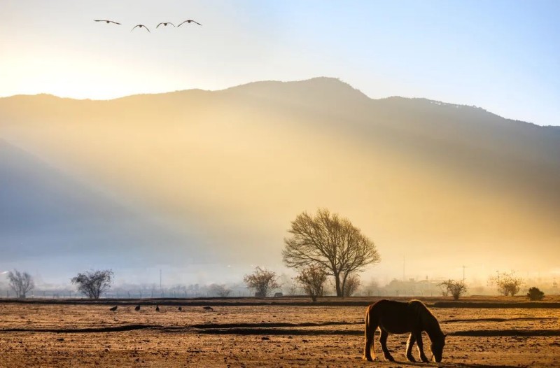 深秋在日落時(shí)分更顯山水的浪漫詩意。當(dāng)太陽開始西沉,天空的色彩從明亮的藍(lán)逐漸轉(zhuǎn)變?yōu)槿岷偷呐{(diào),最先是淡淡的金黃,然后橘色、粉色、玫紅接踵而至,最后整片天空仿佛燃燒了起來,云彩被鑲上了金邊,層層疊疊地鋪展在天幕上。拉市海的水面變成了一面巨大的鏡子,完美地倒映著天空中這片色彩。遠(yuǎn)處的群山成了黛色的剪影,馬兒在濕地上悠閑地啃食著野草。