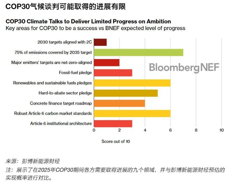 盡管如此,基于九項(xiàng)具體目標(biāo)的預(yù)期達(dá)成度,彭博新能源財(cái)經(jīng)對(duì)COP30取得成功的概率評(píng)分為4.1分(總分10分)。作為會(huì)議主辦國(guó)和大會(huì)主持,巴西對(duì)本次會(huì)議的定位是“落實(shí)型COP”,即推動(dòng)具體行動(dòng)承諾的落實(shí),完善2015年《巴黎協(xié)定》的細(xì)節(jié),而非尋求突破性進(jìn)展。