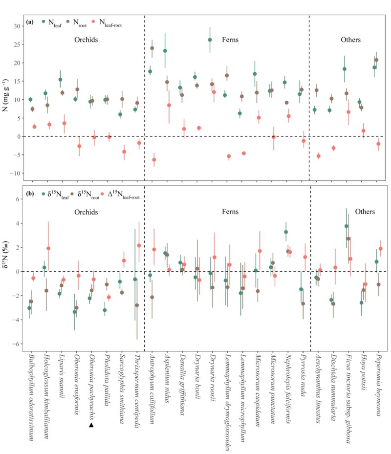 中國科學(xué)院西雙版納熱帶植物園(以下簡稱“版納植物園”)研究團(tuán)隊(duì)在云南西雙版納熱帶地區(qū)不同生境(版納植物園、勐侖鎮(zhèn)、213國道沿線和銀廠)中,采集了涵蓋多個(gè)類群的24種附生維管植物的葉片和根系材料,測(cè)定其C、N含量及δ13C、δ15N,系統(tǒng)回答了上述科學(xué)問題。結(jié)果表明:1)附生維管植物葉-根間15N分餾效應(yīng)( 0.43‰)較小,與地生植物(2‰)相比,反映了森林冠層比地面生境存在更嚴(yán)重的N限制; 2)附生植物的葉-根15N分餾在不同分組間保持相對(duì)一致,但具有顯著的物種特異性,且與系統(tǒng)發(fā)育無顯著相關(guān),反映了外部N源及其N獲取策略的綜合影響; 3)附生植物的葉-根15N正分餾主要與葉片N、根C相關(guān),而負(fù)分餾與葉片δ13C相關(guān),暗示不同因素(如外部氮源、水分虧缺和氮獲取策略)驅(qū)動(dòng)著其體內(nèi)15N分餾過程。
