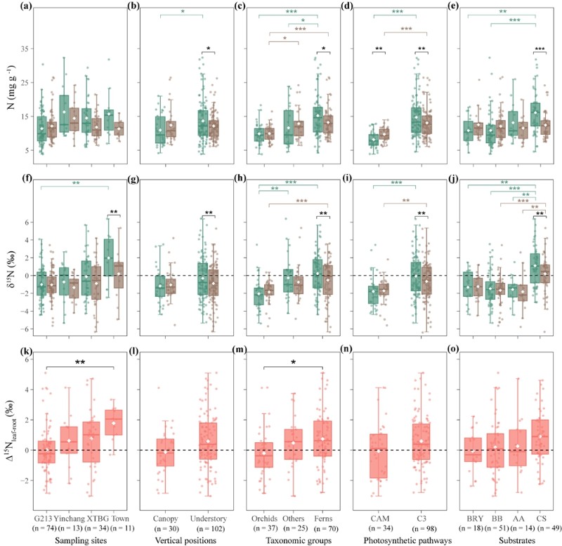 這些發(fā)現(xiàn),不僅證實(shí)熱帶地區(qū)附生類群與陸生類群(P限制)存在不同的營養(yǎng)限制模式,而且首次系統(tǒng)闡明了附生維管植物體內(nèi)15N分餾效應(yīng)及驅(qū)動(dòng)因素。研究還表明,附生植物存在小但顯著的葉-根15N分餾;在充分考慮此分餾效應(yīng)的前提下,分析葉片δ15N可以準(zhǔn)確解析熱帶附生植物的N動(dòng)態(tài)。同時(shí),研究強(qiáng)調(diào)了環(huán)境因素與物種特異性在不同尺度研究中需予以綜合權(quán)衡考慮。該研究對(duì)基于氮同位素技術(shù)探索維持森林冠層植物多樣性的潛在機(jī)制具有重要價(jià)值。