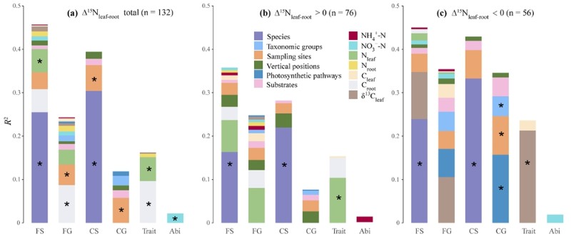 圖4云南西雙版納熱帶地區(qū)附生維管植物根葉分餾(?15Nleaf?root)驅(qū)動(dòng)因素