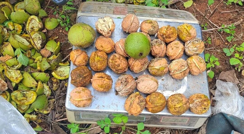 通過實地檢測,2021年—2022年核桃品種改良項目已進入掛果期。拖布卡鎮(zhèn)松坪村雙水井小組樣地1.7畝原有35株(“云新早食”30株、“三臺”5株),經調查:2020年單株青皮果產量平均32公斤、平均畝產658.8千克;新鮮核果出果率25%,平均畝產量165千克。果實成熟早,飽滿度低,核果皮薄,易腐爛、難加工,市場價格5元/千克,畝產值825元。2021年嫁接改良的昭通“麻2”,2025年進入掛果期,青皮果單株產量45千克,平均畝產926千克;經現(xiàn)場檢測,新鮮核果出果率28.3%,平均畝產新鮮核果262千克,市場價格10元/公斤,畝產值達到2620元。同地塊中原有的35株核桃經2021年改良為昭通“麻2”品種后,4年后產值提高了3倍多,形成同一個立地條件,同一個核桃良種,同一套管理措施,果實成熟期一致,采收容易,果實均勻,解決了同一地塊品種雜、管理難、品質差、成熟期不一致等問題,同時降低農戶管理成本,有效保證核桃品質,價格好、易銷售,切實讓種植戶得到收益。