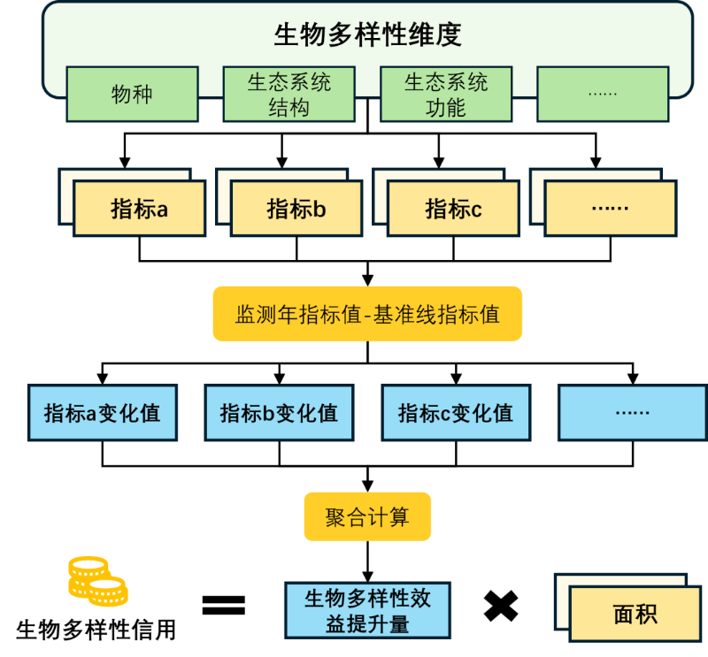 較為常見的核算方法是選擇一系列指標(biāo)代表生物多樣性的不同維度,采用加和、平均等指標(biāo)聚合計(jì)算方式,分別計(jì)算出保護(hù)和恢復(fù)行動和基準(zhǔn)線情景下某監(jiān)測年對應(yīng)的生物多樣性狀態(tài)或效益,兩者相減計(jì)算得出的差值即生物多樣性凈增益,再與面積相乘,得出監(jiān)測年的生物多樣性信用數(shù)量。或先根據(jù)指標(biāo)在保護(hù)和恢復(fù)行動和基準(zhǔn)線情景下的變化量,再進(jìn)行聚合計(jì)算,最后與面積相乘,得出監(jiān)測年的信用數(shù)量。