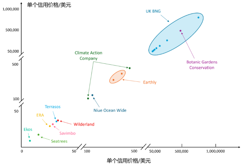 圖3 不同生物多樣性信用機(jī)制下單個信用的價格 ? TNC(數(shù)據(jù)來源:bloomlabs; OPIS; DEFRA)