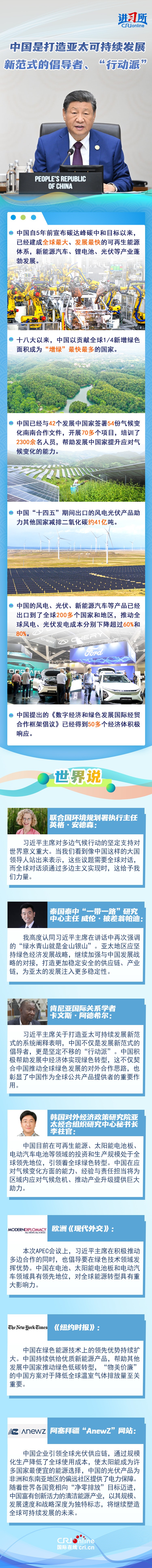 “我們要本著對子孫后代負責(zé)的態(tài)度,加強各經(jīng)濟體綠色發(fā)展戰(zhàn)略對接,促進優(yōu)質(zhì)綠色技術(shù)和產(chǎn)品自由流通,加快推動發(fā)展方式綠色低碳轉(zhuǎn)型,積極應(yīng)對氣候變化?!?1月1日,中國國家主席習(xí)近平在亞太經(jīng)合組織第三十二次領(lǐng)導(dǎo)人非正式會議第二階段會議講話中提出,要堅持綠色低碳,打造亞太可持續(xù)發(fā)展新范式。