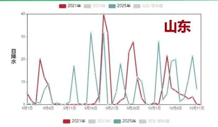 與2021年相比,2025年秋季山東日降水量及降水天數(shù)明顯增加。