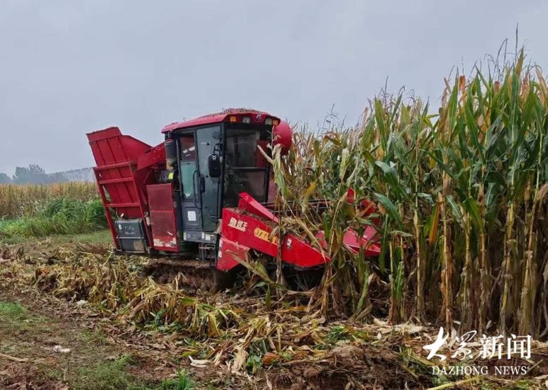 10月12日,在肥城市桃園鎮(zhèn)里留村,履帶式收割機正在濛濛細(xì)雨中搶收玉米。