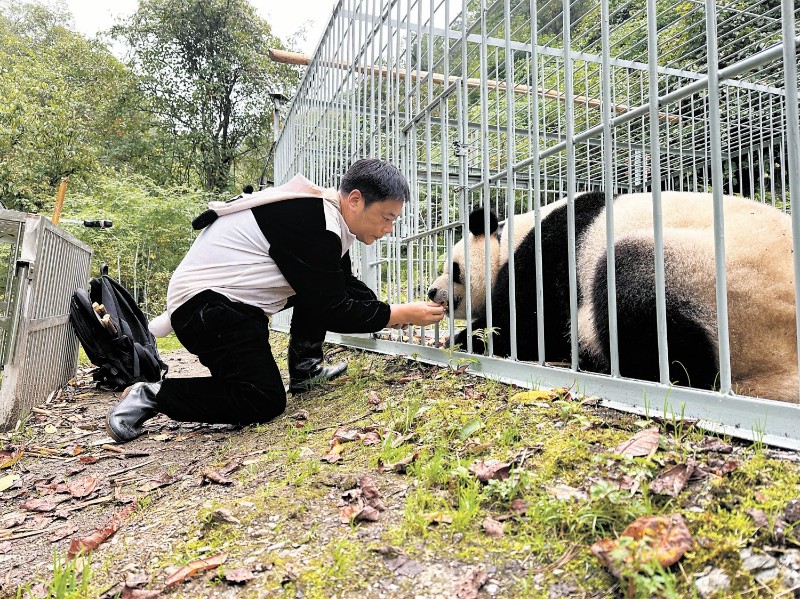 劉曉強(qiáng)在天臺(tái)山野化培訓(xùn)圈為大熊貓“賢賢”做行為培訓(xùn)。中國(guó)大熊貓保護(hù)研究中心供圖