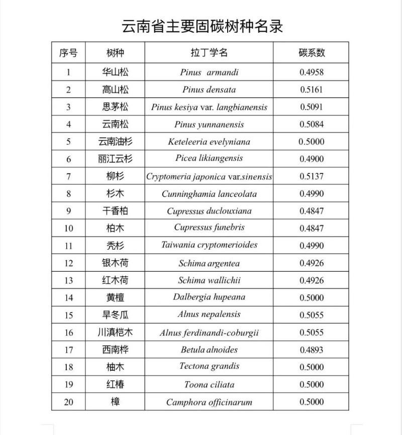 為深入貫徹落實(shí)黨中央、國務(wù)院關(guān)于碳達(dá)峰、碳中和的重大戰(zhàn)略決策,持續(xù)推進(jìn)林草碳匯工作。近日,云南省林業(yè)和草原局發(fā)布了華山松、高山松、思茅松、云南松、云南油杉、麗江云杉、柳杉、杉木、干香柏、柏木、禿杉、銀木荷、紅木荷、黃檀、旱冬瓜、川滇榿木、西南樺、柚木、紅椿、樟等20種主要固碳樹種。
